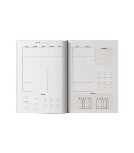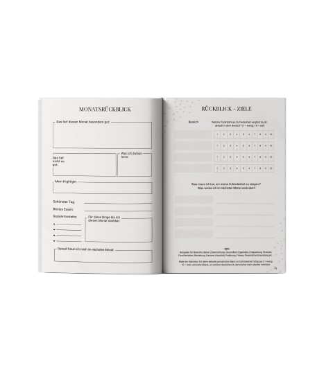 🔸3 Seiten Monatsrückblick (Highlights des Monats, Finanzen, Ziele) 🔸 Achtsamkeitsimpulse und Organisationstipps 🔸Inspirationen für deine Ziele, Bucket List, Routinen 🔸Finanz- und Putzplanübersicht