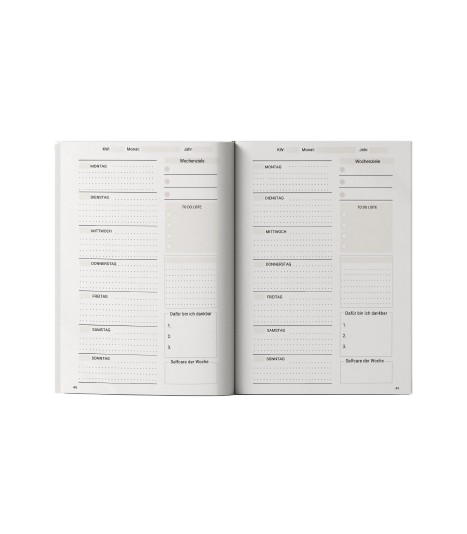 🔸12 Monate inkl. eine Seite pro Woche (Montag bis Sonntag) 🔸Wochenziele, Prioritäten, Dankbarkeit und Selfcare der Woche 🔸Zusätzliche individuelle Kategorie für dich